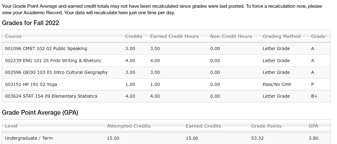 이번 9월 학기에 MNSU 간호학과에 입학한 강 * 윤 학생이 전과목 A ! 앞에서 아쉽게도 통계학 한과목에 B+ 를 받았네요.