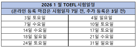 2025년 ~ 2026년 토플 시험일정입니다.