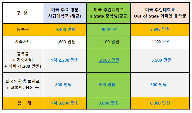 위 표를 보면 "미국 명문 사립대학 학비는 1년에1억이 넘는다"는 말을 체감할 수 있습니다. 표에 포함된 미국 사립 명문대학교의 학비와 기숙사비 그리고 식대를 각 대학 홈페이지에서 확인한 결과, 연간 약 1억 1천에서 1억 2천만원이 듭니다. 여기에 포함되지 않은 기타 비용인 생활비, 용돈, 통신비, 교통비 및 기타 비용을 감안하면 미국 명문 사립학교에 자녀를 보낼때 1억 3천만원 정도의 연간 비용을 예상할 수 있습니다.