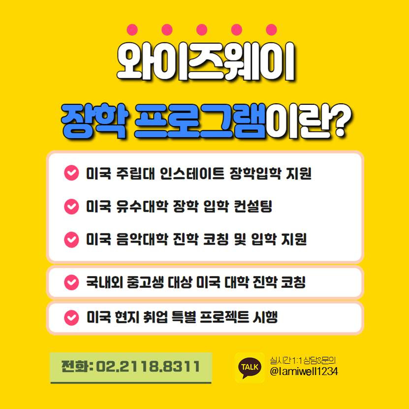 Wise Way 장학 프로그램에 대한 자세한 사항은 와이즈웨이 유학센터 "홈페이지" 를 검색해 보세요. 입학 보장 대학 16개 대학과 인스테이트 학비, 필요한 토플과 SAT 점수 등을 보실 수 있습니다.