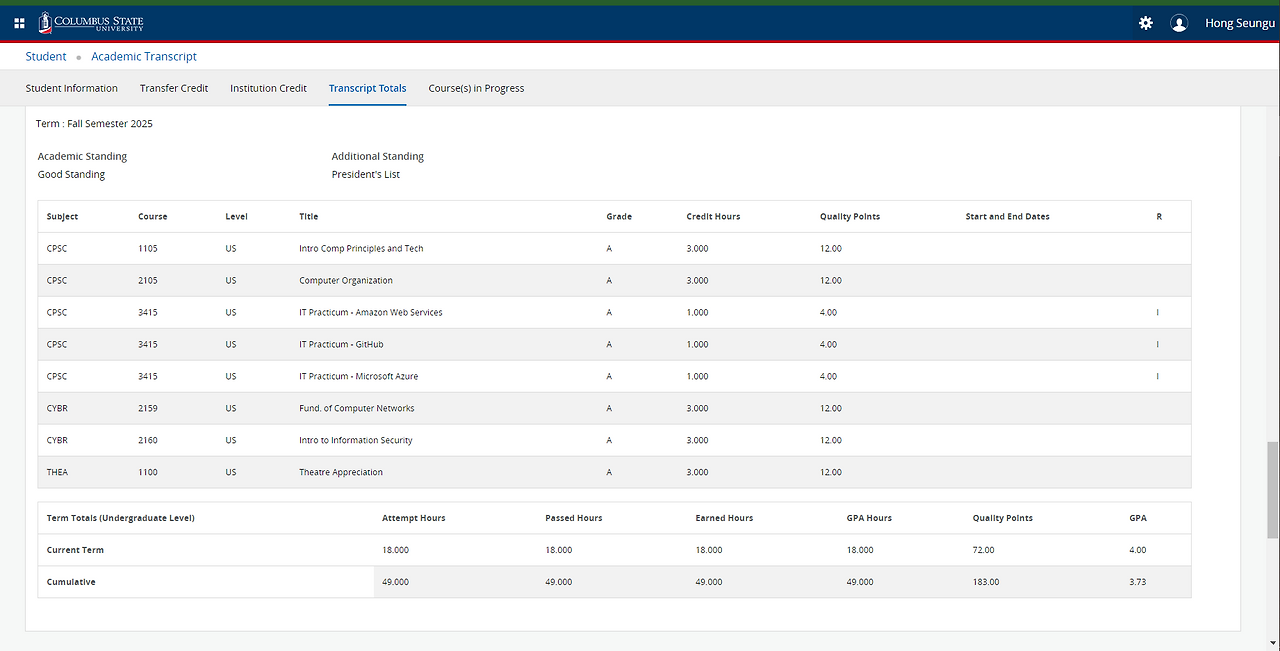 저는 1학년을 마친 후 한국으로 돌아와 국방의 의무를 다하고 2025 가을학기부터 복학을 시작하였습니다. 긴 공백기 후 첫 학기라 다양한 어려움이 있었지만 복학과 장학금 문제를 잘 해결하고 이번 학기에 다시 <전과목 A>로 마무리할 수 있었습니다.