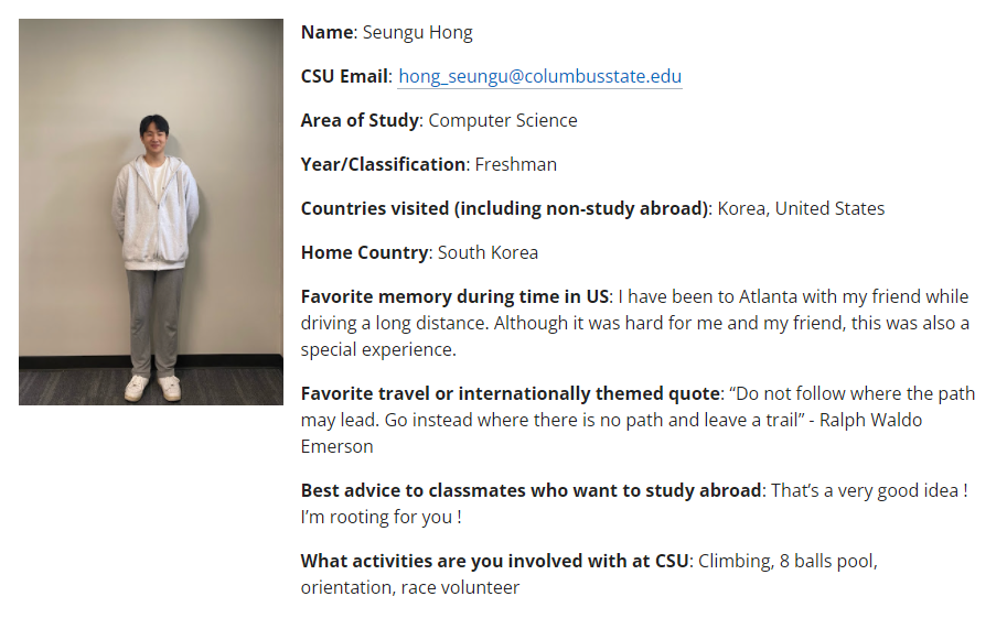 2021년 CSU 장학생으로 입학한 홍*우 학생이 CSU 홈페이지에 소개된 내용입니다^^