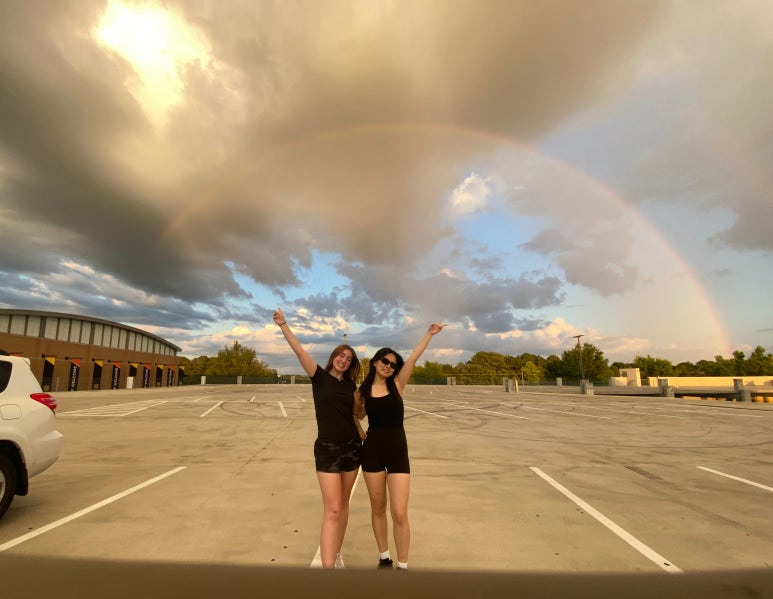 <KSU 교정에 핀 무지개를 뒤로 동기와 경쾌한 포즈를 취한 이*솔 장학생 >